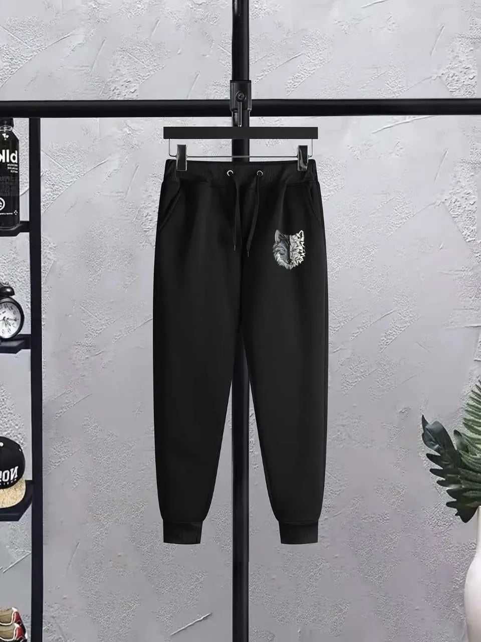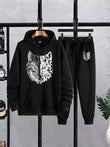 Men's Black Printed Fleece Hoodie Track Suit - 2 Pcs, Wolf